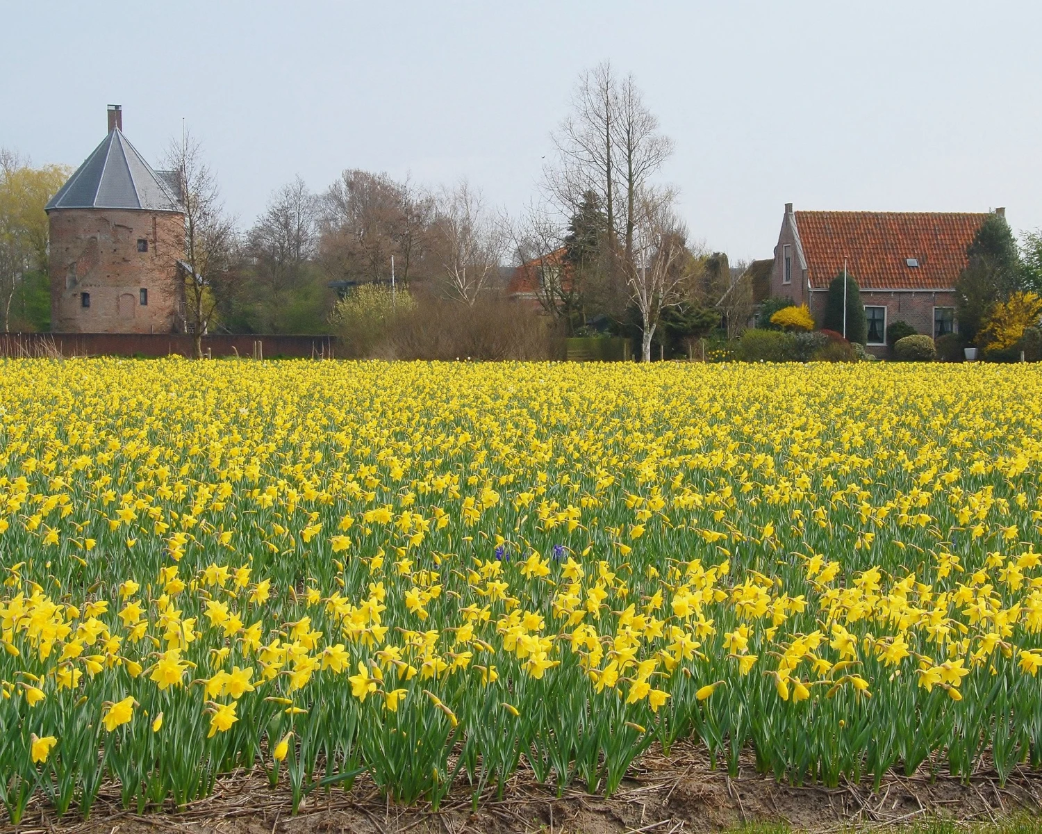 A large yellow narcissus with a difference, Narcissus ‘Carlton’ paints itself with a full palette of yellows as it presents its large and long-cupped flower to the sun in early to mid-spring. Outer petals of sunny yellow, tinged with a hint of lime to brighten them still further, provide a showy skirt for a trumpet-like cup. Inside the cup the colours change through a range of deep and pure yellows and an almost pale orange in the build-up to its loosely-frilled top.