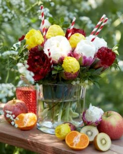 The hardy, herbaceous Peony ‘Immaculée’ is the perfect addition to Farmer Gracy’s range—it produces stunning semi-double white flowers, with very pale-yellow petals in the centres. Curiously, the flower buds first open to reveal pale pink blush petals, before they turn to white. In the centre of each bloom is a loose cluster of bright red stamens. Held on stiff, upright stems, the blooms are bowl-shaped, and spicily scented. They light up late spring and early summer beds, borders or containers.