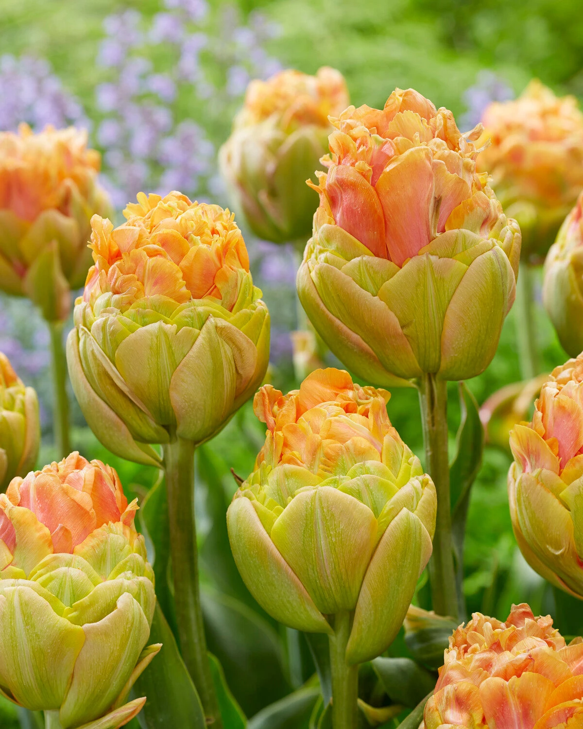 Welcome the warm glow of Tulip ‘Le Lavandou’ into your garden next spring—whatever the weather, this tulip with its glorious petal-packed blooms is bound to bring a good helping of spring cheer. Tulip ‘Le Lavandou’ has many notable features which enable a high impact, impressive show. The first being its fully double blooms which are large, including a lower layer of pale green petals from which a mass of mango-orange petals burst from the centre. Secondly, its height—on tall, sturdy stems, the ball-like blooms will bob beautifully above lower-growing varieties and will also be useful for displaying in tall vases.